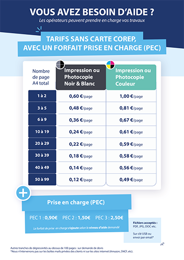 Les tarifs des cartes Corep sont affichés en agence et peuvent varier, mais le coût des impressions est généralement au moins divisé par 2, voire plus, en fonction du nombre de copies à réaliser. De plus, la carte Corep est disponible dès la première copie couleur ou l'équivalent de 10 copies noir & blanc, donc privilégiez ce fonctionnement pour les impressions simples que vous pouvez réaliser sans l'aide d'un opérateur.