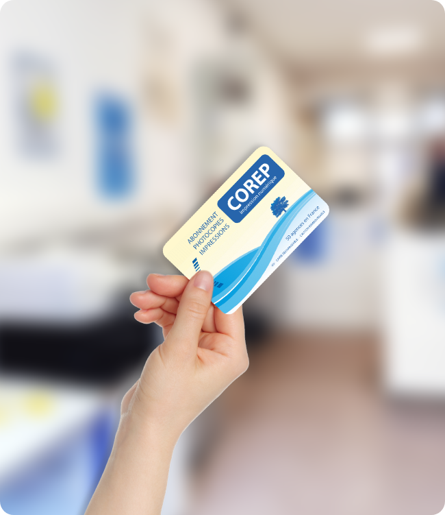 La carte Corep est le moyen idéal pour gérer vos impressions, photocopies et scans en toute autonomie. Valable sans limitation de durée et utilisable dans toutes les boutiques Corep en France (50 agences), elle vous offre une solution pratique et économique pour vos besoins du quotidien.