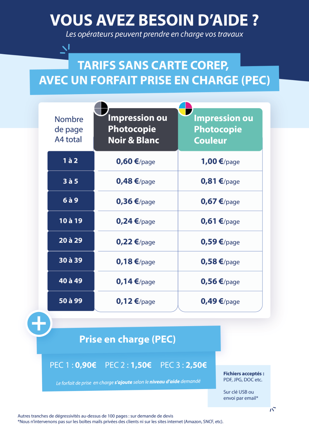 La prise en charge de petites impressions accessibles en libre-service peuvent être prise en charge par un conseiller, mais cela engage un surcoût que l'on appelle PEC (Prise En Charge)